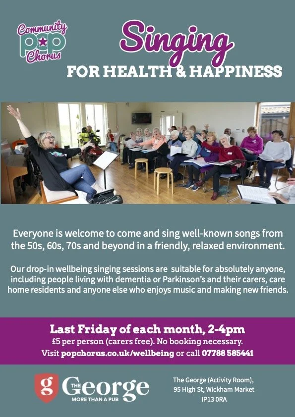 Community Pop Chorus is the not-for-profit, social enterprise arm of Suffolk community choir Pop Chorus, offering a range of inclusive, accessible, singing-based activities to promote wellbeing.